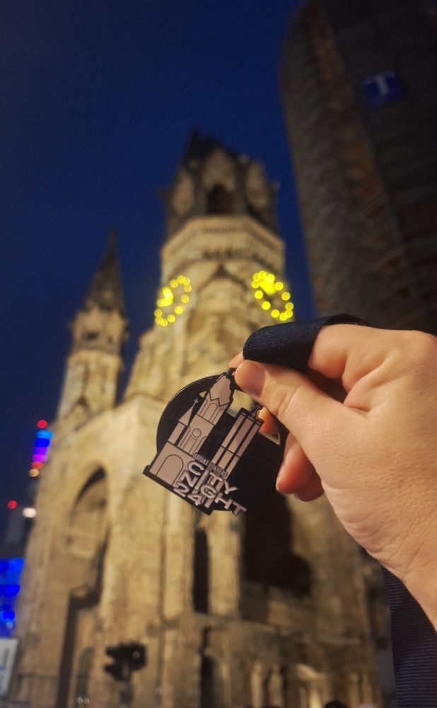 3 Läufer auf zwei Strecken mit einem Ziel. Das Finish durch das leuchtende Zieltor an der Gedächtniskirche.